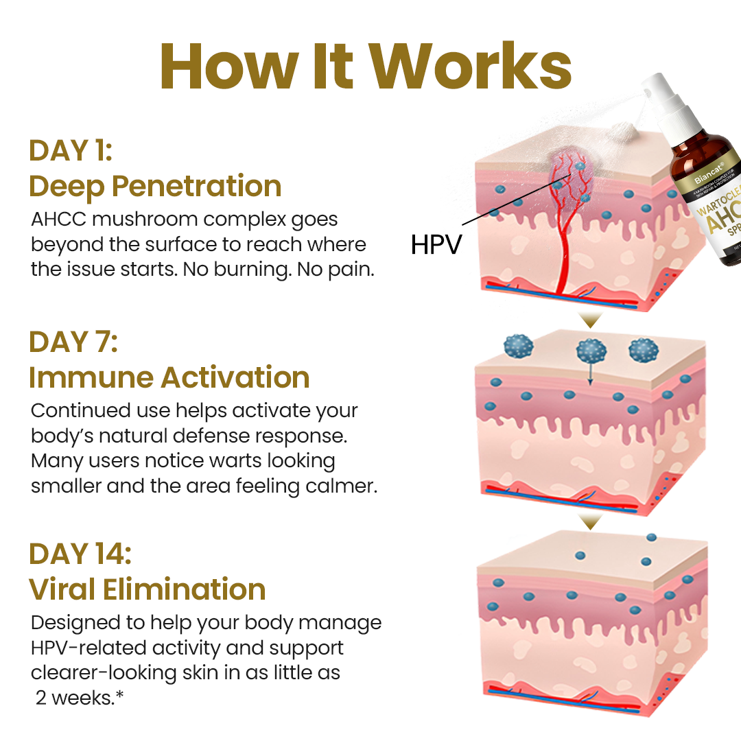 Biancat® WartoClear AHCC Spray is designed to support your body at a deeper level—helping address the underlying viral activity while being gentle on healthy tissue. No harsh burning. No scarring. Just supportive, skin-friendly care.