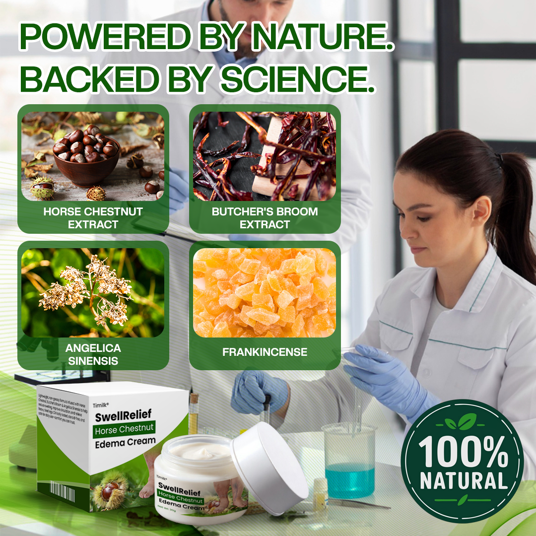 Circulate Better Blood Flow: Timilk® SwellRelief is powered by Horse Chestnut Extract (Aescin), clinically shown to strengthen veins and improve circulation. By boosting healthy blood flow, it helps reduce swelling, puffiness, and that heavy-leg feeling. With added herbal extracts, this cream soothes discomfort while supporting lighter, more energized legs—naturally and safely.